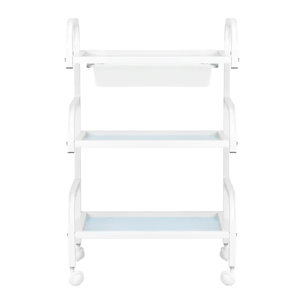 Stelaż z trwałego aluminium w odcieniach bieli oraz szklane półki tworzą nowoczesną i estetyczną całość, którą łatwo utrzymać w czystości. Cztery kółka zapewniają mobilność, co ułatwia organizację przestrzeni roboczej, a solidne materiały gwarantują stabilność i długie użytkowanie.