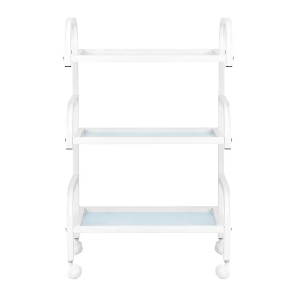 Stelaż z trwałego aluminium w odcieniach bieli oraz szklane półki tworzą nowoczesną i estetyczną całość, którą łatwo utrzymać w czystości. Cztery kółka zapewniają mobilność, co ułatwia organizację przestrzeni roboczej, a solidne materiały gwarantują stabilność i trwałość użytkowania.