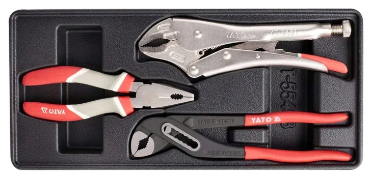 Wkład do szuflady zawierający szczypce. - wkład - szczypce uniwersalne YT-2007 długość 180 mm - szczypce nastawne YT-2090 długość 250 mm - szczypce zaciskowe morse'a YT-2451 długość 250 mm
